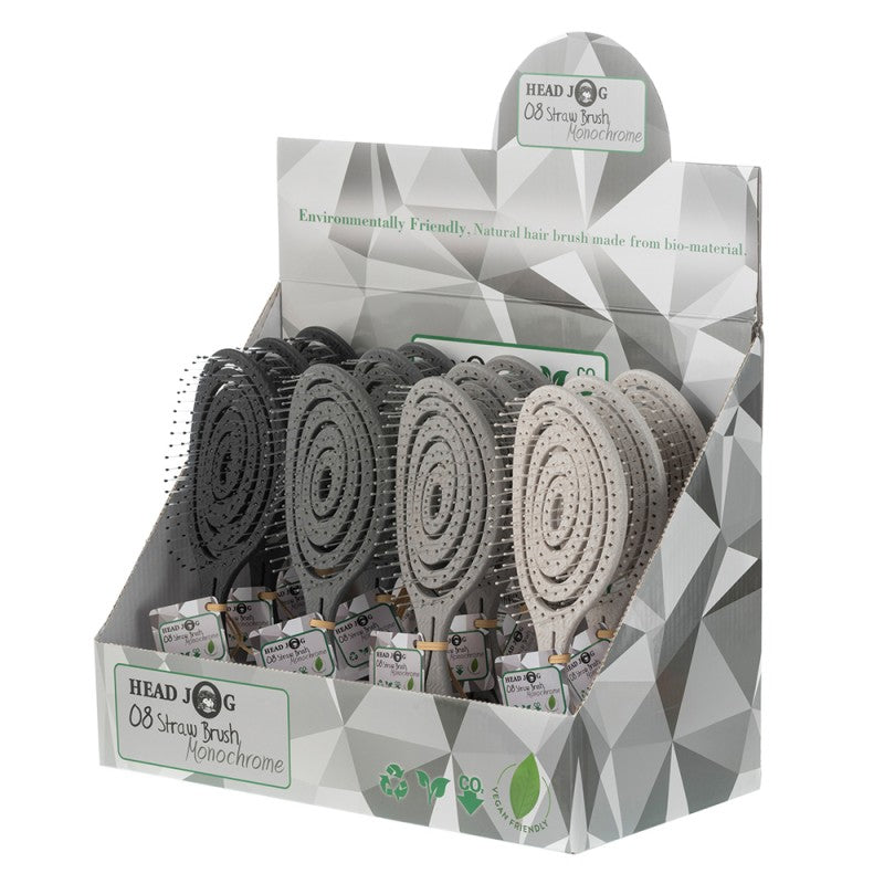 The Head Jog 08 Straw Brushes are sold individually in the Monochrome Collection (Charcoal, Graphite, Silver and Ash), the Berry Collection ( Blackberry, Blueberry, Rasp berry and Gooseberry) and the Original Collection (Heather, Mint, Oatmeal and Sage), or as a display box in each collection - containing 3 of each 4 brush colours.