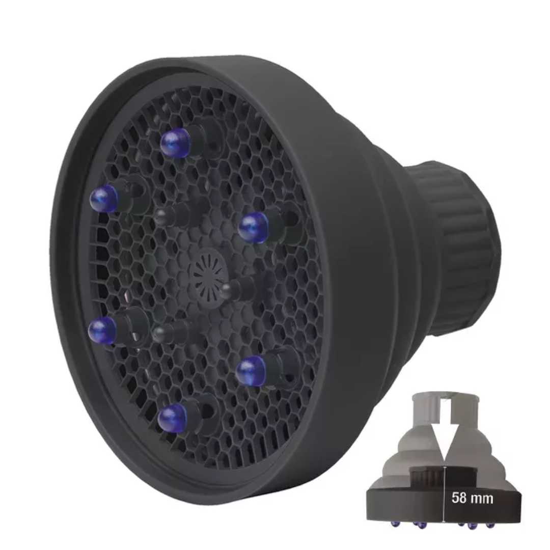 Introducing our innovative 9-finger hair dryer diffuser, crafted from durable thermal-insulating silicone for optimal performance. This compact diffuser retracts to a convenient 58mm, making it the perfect tool for mobile hairdressers and salon professionals on the go.