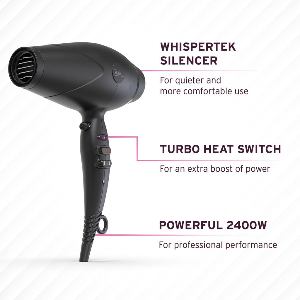 The Wahl Style Dryer delivers powerful, fast drying at a lower heat with it’s Quick Dry Airflow. The 2400 watt dryer features a Whispertek Silencer, reducing the noise when using this powerful hair dryer.
