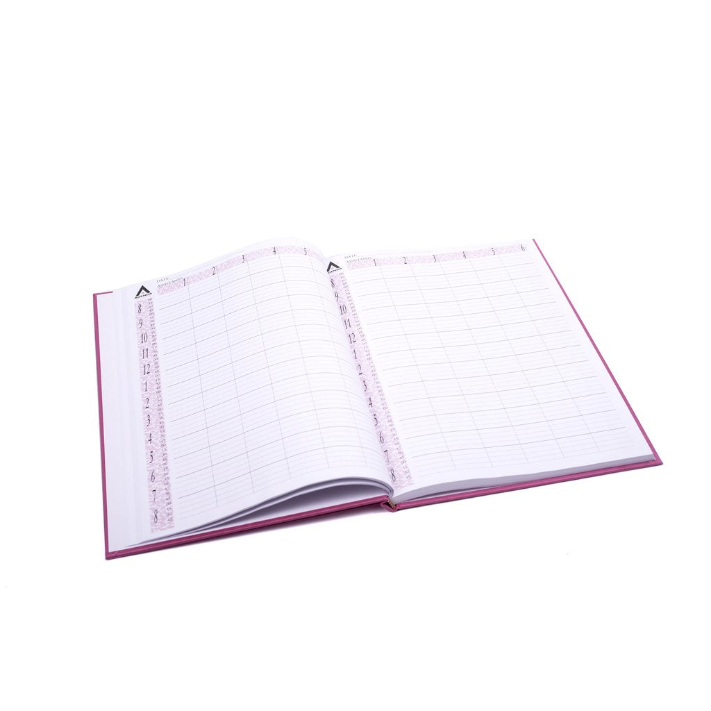 15 minute intervals, 8am to 8.45pm, one page per day. Hard case bound in Pink Kaskar.