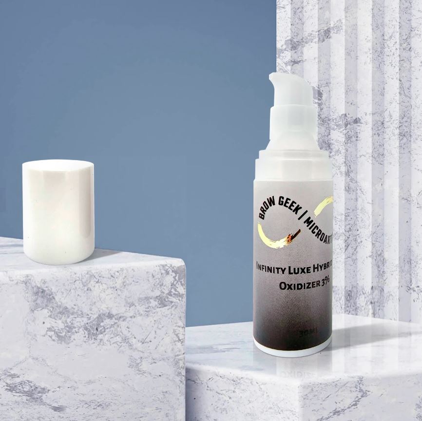 Large 30ml (3% 10 Vol) Cream Style Oxidizer. Gentle for brows and lashes. Created with the working artist in mind, this one of a kind airless pump developer is the first on the market! This is the developer bottle of the future! No more squeezing and slamming your developer like a bottle of Ketchup trying to extract product. Formulated to be used with Infinity Luxe Hybrid Tint.