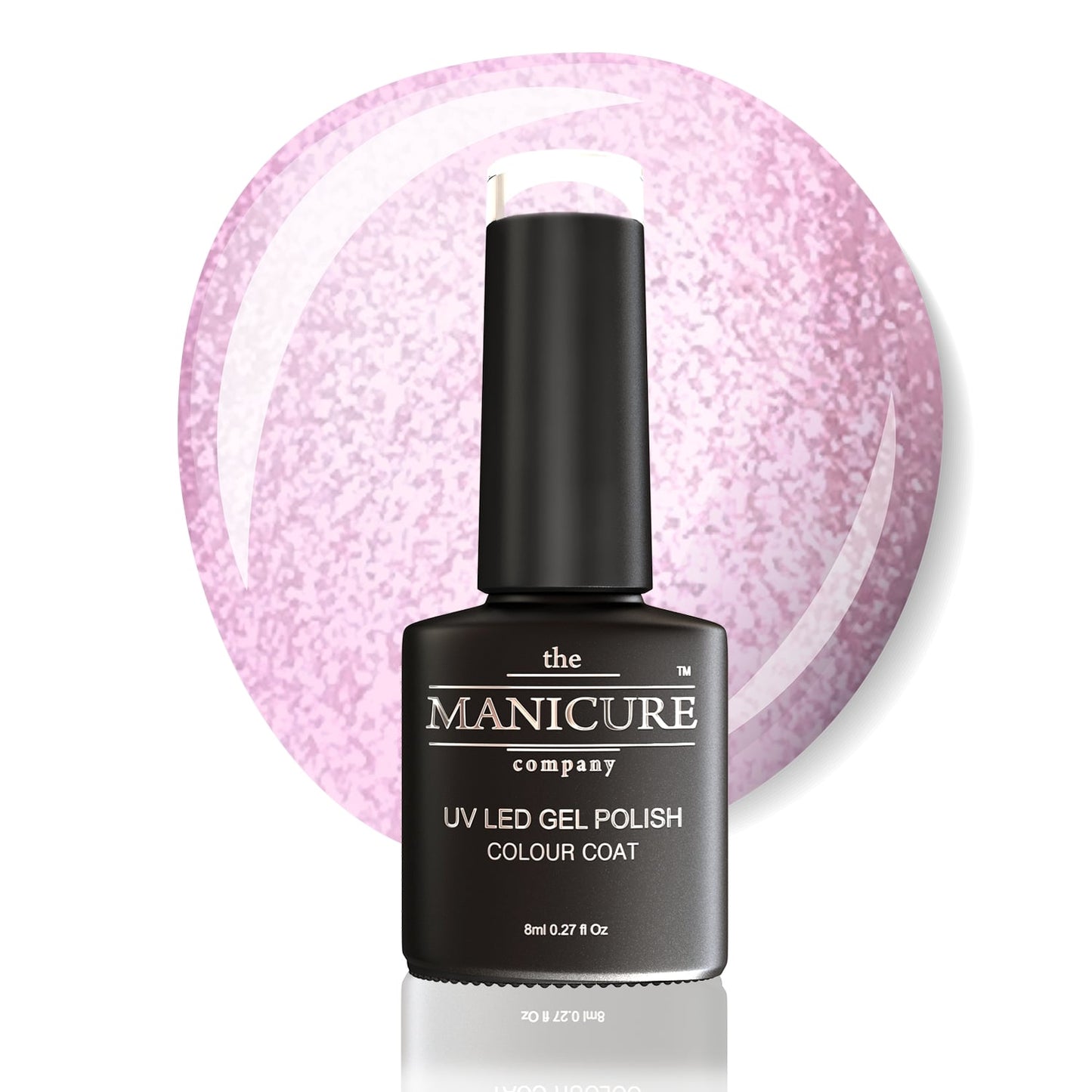 Champagne Dreams gel nail polish is a unique, beautiful light, shell pink full of rainbow reflective glitter. it's drama but still very classy. Perfect as an accent to any pink or nude gel manicure. It has an opaque finish.